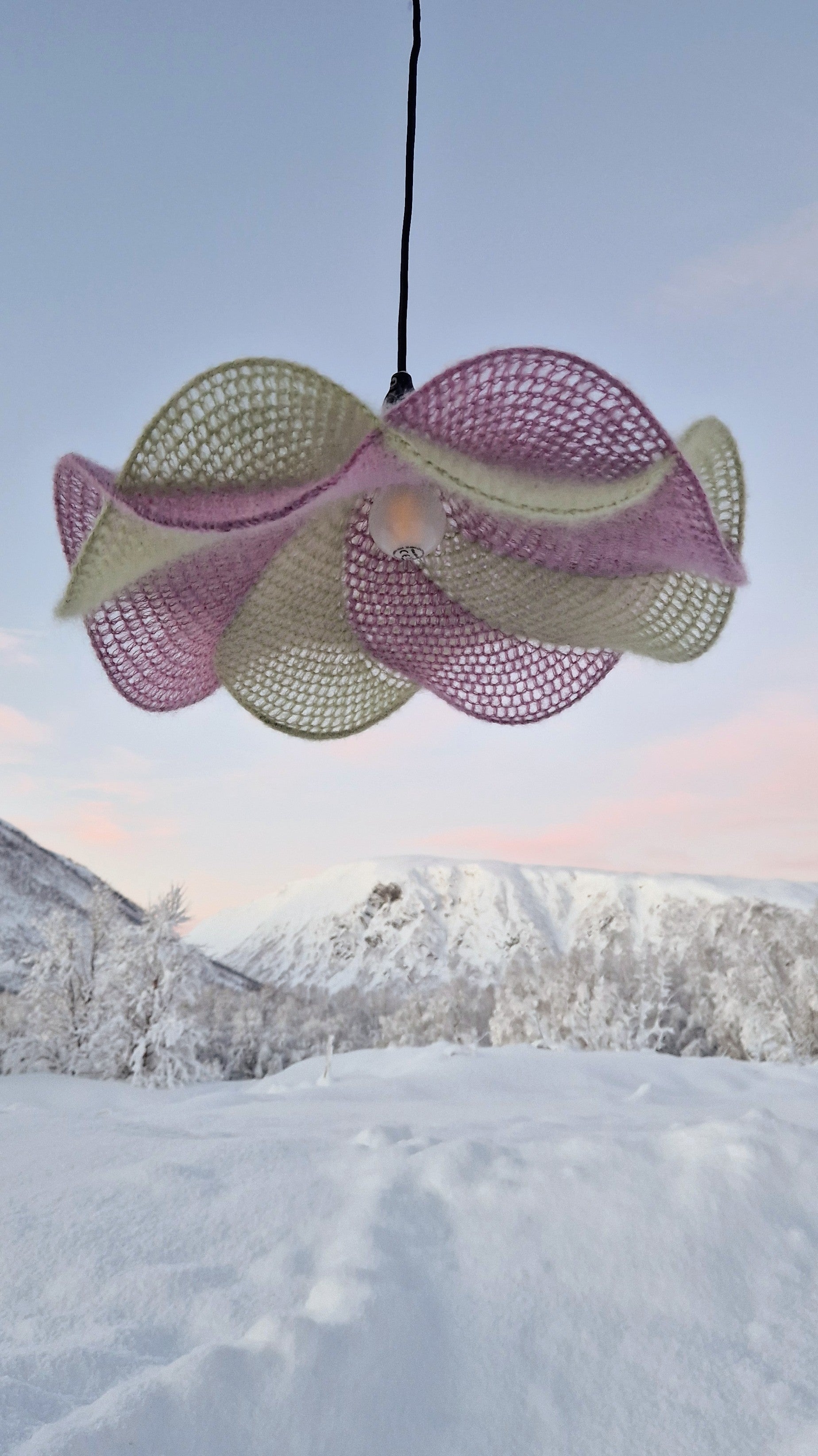 The lamp was designed and handmade in Northern Norway, out of locally sourced leftover mohair yarn. The material gives it soft glow and texture, beautiful colors, as well as natural fire-resistance.
